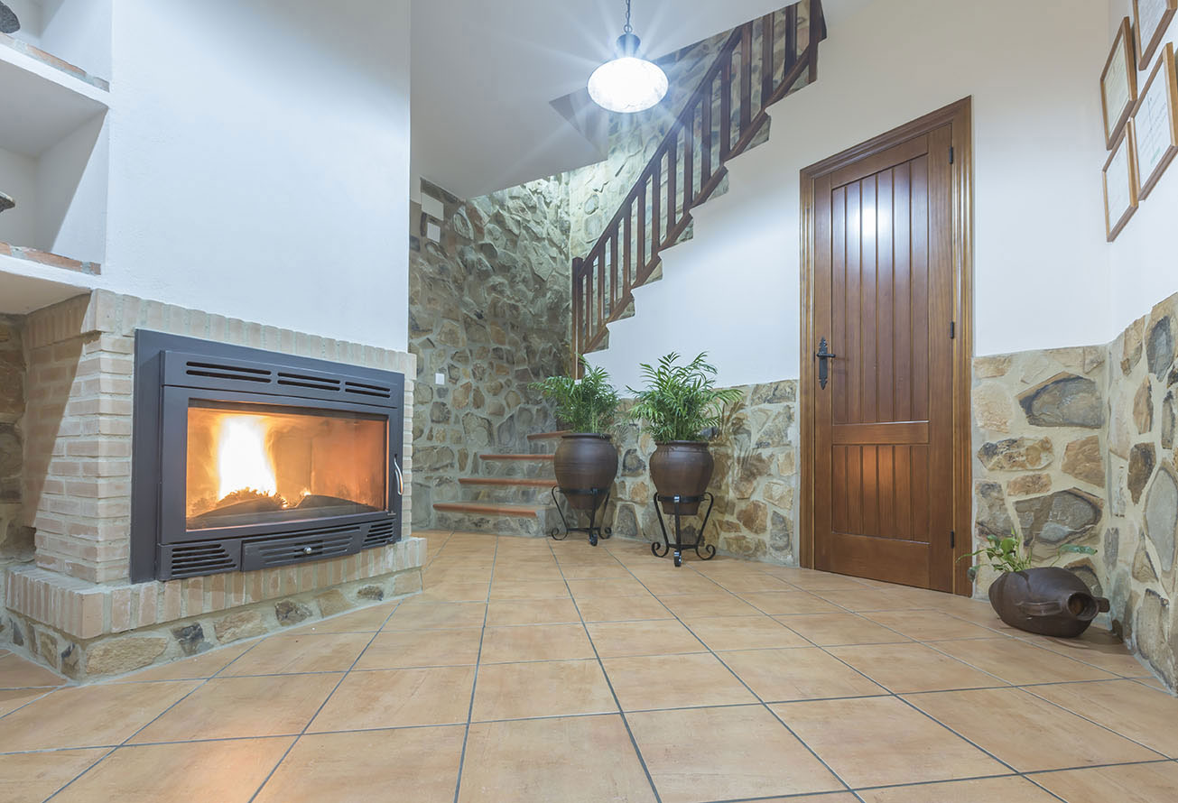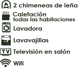 una cocina completamente equipada, salón amplio con chimenea y patio exterior con barbacoa.